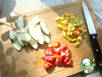 Режем овощи произвольно. Кабачок-пластинами тонкими, перец и помидоры-мелким кубиком. |