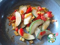 В оливковом масле обжариваем пластины кабачка, выкладываем перец и помидор и чуть томим-минут 5. Солим и перчим по вкусу. |