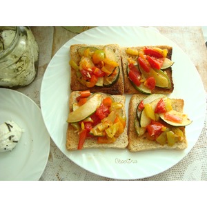Описание: Подсушенный хлеб на гриле, в духовке или в тостере с овощами чуть обжаренными в оливковом масле и чесноком.