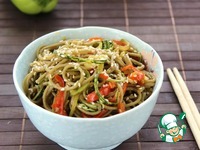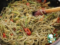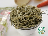 Отварите любую лапшу до состояние аль денте, то есть, немного её недоварив, дайте стечь воде. У меня лапша с зеленым чаем. Хорошо подойдет для этого блюда лапша рисовая, кукурузная и пр. виды. |