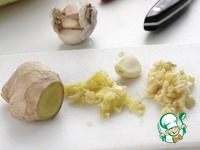 В глубокой сковороде разогрейте растительное масло, желательно оливковое и быстро обжарьте чеснок с имбирем, около минуты. Влейте в сковороду соевый соус и жидкий мёд, все перемешайте. |
