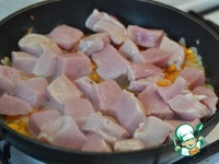 Мясо нарезать на средние куски. Добавить к луку и моркови. Обжарить. |