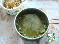 Листья для долмы нужно срывать свеженькие и молоденькие. Моем и выкладываем в посуду. Заливаем кипятком и даём постоять пару минут. |
