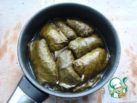 Заливаем бульоном, чтобы он покрыл верх и сверху прижимаем тарелкой, чтобы листья в процессе варки не развернулись. Ставим варить минут на 40-60. |