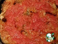 В обжаренный лук добавила томат, хорошо все перемешала и оставила на маленьком огне потомиться еще минут 5-7, периодически не забываем помешивать. Выключаем огонь и оставляем. |