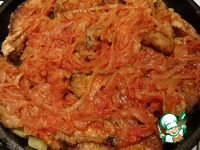 Сверху рыбы кладем обжаренный лук в томате. |
