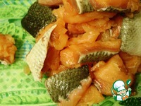 Рыбное филе с кожей нарезать крупными кубиками. Чуть присолить и сбрызнуть ложечкой лимонного сока. Оставить минут на 15. |