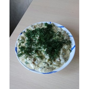 Теперь перекладываем грибы в пиалу и украшаем второй частью укропа. |