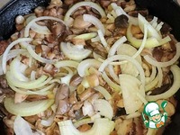 Обжариваем грибы минут 7 и добавляем нарезанный лук. Солим, перчим и хорошо все перемешиваем. Жарим еще 5 минут периодически помешивая. |