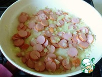 Нарезаем сосиски колечками и добавляем к луку. Обжариваем их еще 5 минут. |