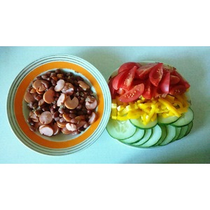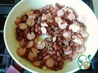 Из банки с фасолью сливаем жидкость и добавляем ее в сковороду. Посыпаем черным молотым перцем и солью и перемешиваем. Накрываем крышкой и готовим в течении 10 минут. |
