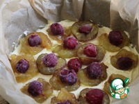 Выложить на тесто - вдавливать НЕ надо, срезом вверх и не вплотную друг к другу сливы, в середину каждой сливы я положила по вишенке. |