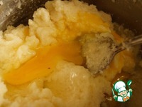 В кашу добавить яйца и тщательно перемешать. Яйца лучше взбить отдельно вилкой и добавлять постепенно, так как жидкая масса нам не нужна. Если все же получилось жидковато -добавьте немного муки. |