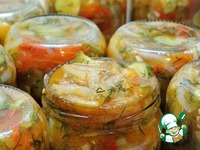 Описание: В прошлом году по осени осталось у меня море помидоров, да и огурцы в теплице продолжали радовать урожаем, в связи с этим назрел вопрос, как из минимума ингредиентов соорудить салат. Вот тут на помощь пришла мне K Olga S, приславшая рецепт салата в личной переписке. Приготовив салат и с удовольствием распробовав его зимой, хочу теперь поделиться и с вами.