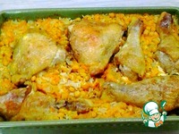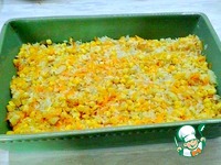 Переложить рис в форму для запекания, добавить соль, специи для плова, перемешать и равномерно распределить по дну формы. |