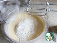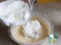 Желтки взбиваем с сахаром до бела. Добавим масло и воду. Далее добавляем муку с разрыхлителем и ванилином. |
