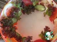Обкладываем кусочками лимона, помидора, огурца и листьев салата. |