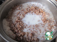 Добавляем молоко и доводим до кипения. Творог можно добавить вместе с молоком, и довести до кипения. Кладем сливочное масло и оставляем на 15-20 мин. для набухания. |