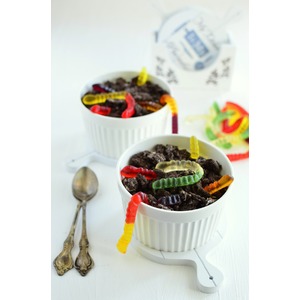 Печенье смолоть в крупные кусочки, я воспользовалась скалкой. Печенье выложить на кашу, после чего украсить кашу мармеладными червяками. |