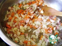 В глубоком сотейнике распустить на среднем огне в масле нарезанную кубиками грудинку. Чуть ее зарумянить и выложить лук, чеснок и морковь. Тушить до легкой золотистости. |