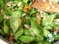 Добавить зеленую фасоль, нарезанный уголками зеленый перец, стебли сельдерея и слегка обжарить. |