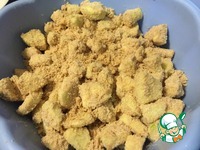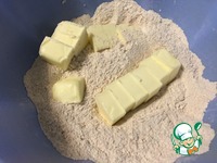 Добавляем сливочное масло, нарезанное на небольшие куски и перетираем руками до состояния мелкой крошки. |