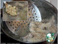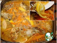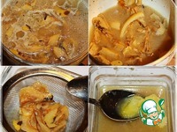И поставил на огонь. Выпаривать надо примерно до одной трети начального объема. Потом удаляем лимон. И перетереть сваренное в бульоне через сито и заправить соус маслом. |