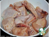 Курицу уже выложим в глубокую чугунную сковороду (или кастрюлю), толстостенную и глубокую. В ней, кстати, и готовить будем. |