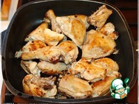 А потом в этом же масле обжариваем курицу. Также как и айву. Сначала с одной стороны. |