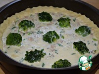 Залить яично-сливочной смесью. Вдавить в пирог соцветия брокколи. (капусту размораживать не нужно) |