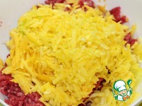 Вместе с фаршем прокрутить и мякоть кабачка. Или потереть ее на крупной терке |