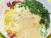 К фаршу добавить репчатый лук, порезанный мелким кубиком, любую мелкопорезанную зелень, кус-кус, посолить и приправить перцем по вкусу. Тщательно вымешать начинку. |
