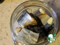Рыбу разморозить. Нарезать кусочками шириной 3-4 см, сложить в банку, добавить поломанный лавровый лист, перец и чеснок, нарезанный пластинками. |