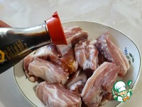 Свиные ребра помыть, обсушить и разрезать на куски с косточкой. Обсыплем черным перцем и добавим соевый соус, перемешаем и оставим на 10-15 минут. |