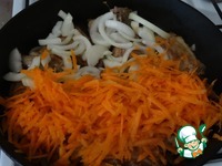 Добавляем лук и морковь, продолжаем обжаривать. |
