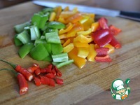 Болгарский перец и перец чили нарезать на маленькие кусочки. |