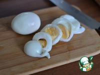 2 яйца сварить вкрутую. Остудить, почистить и нарезать на кружочки. Отложить в сторону. |