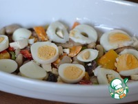 Миску для запекания смазать подсолнечным маслом. Выкладываем половину фасолевой смеси. На верх выкладываем нарезаные яйца. |
