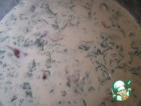 В чашу мультиварки вылить кефир, положить в него мясо и зелень, чесночный порошок и молотый чёрный перец. Перемешать и оставить на 20-30 минут. |