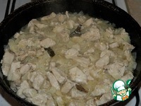 Куриную грудку без шкурки и костей промыть, нарезать небольшими кусочками. Слегка обжарить на растительном масле вместе с порезанным луком. |