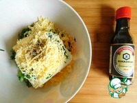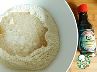 В муке сделаем углубление и вольём туда дрожжевой раствор, а также соевый соус Kikkoman и растительное масло. |