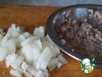 Лук мелко порезать, рыбу размять вилкой. Я ещё убираю косточки и сливаю жидкость, если ее очень много. Если рыбы вам кажется мало - возьмите 2 баночки. |