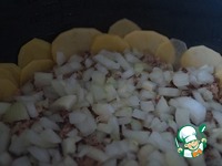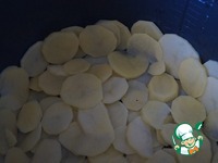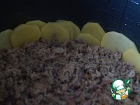 Смазать дно мультиварки маслом, выложить дно кружочками картофеля и из него же сделать бортики. Как вариант, картофель можно натереть на тёрке, посолить и выложить на дно мультиварки. |