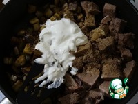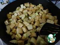 Баклажан очистить от кожуры, я это делаю овощечисткой. Затем нарежьте кубиками по 1.5 см и обжарьте в масле на сильном огне до полуготовности. |
