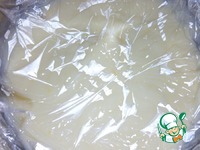Накрываем впритык к крему пищевой плёнкой, чтобы не образовалась корочка и крем не остыл раньше времени (он нам нужен тёплым). |