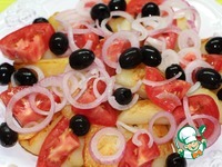 Сверху произвольно (но не мелко) порезанные помидоры, выложить обсушенный маринованный лук, маслины. Посолить и приправить черным свежесмолотым перцем по вкусу. |