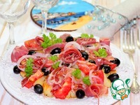 Закончить композицию порезанной произвольно сыровяленной ветчиной. |