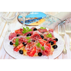Описание: Предлагаю Отведать восхитительный салат в Средиземноморском стиле- обжаренный золотистый картофель, ломтики мясистых спелых томатов, маринованный хрустящий лучок, солоноватая сырокопченая ветчина и горчичная заправка. Вот насколько он в стиле Средиземноморья меня лично берут некоторые сомнения, но в Московском ресторане его позиционируют так. Спорить я не стала, поскольку было невероятно вкусно. Просто подкорректировала, отшлифовала на свой вкус и вышло отменно! Рекомендую как полноценный вкусный ужин.