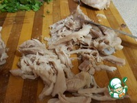 Для начала отварить бедро. Подготовить ингредиенты, мелко нарезать лук, помидоры нарезать кубиками, кинзу нарезать мелко. |