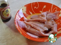 Грудку порезать на пластины и так же мариновать в 2 столовых ложках соевого соуса около часа. |
